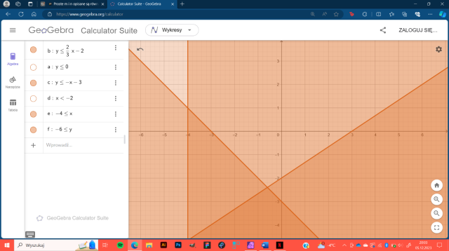 Zapisz nierówność, która opisuje zbiór punktów zaznaczone przez podane proste.