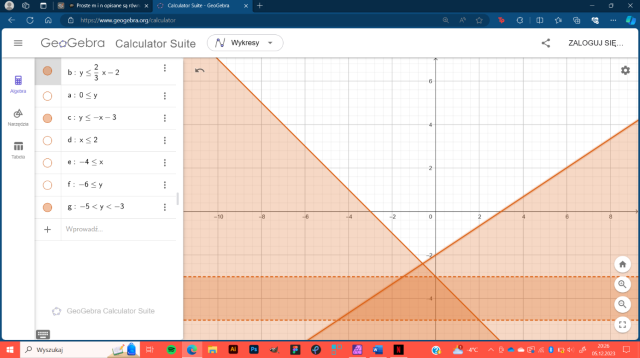 Zapisz nierówność, która opisuje zbiór punktów zaznaczone przez podane proste.