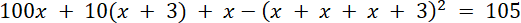 W trzycyfrowej liczbie naturalnej cyfra setek jest taka sama jak cyfra jedności, zaś cyfra dziesiątek jest o 3 większa od cyfry jedności. Jeżeli tę liczbę zmniejszymy o kwadrat sumy jej cyfr, to otrzymamy 105. W tym zadaniu musisz wyznaczyć tę liczbę trzycyfrową.