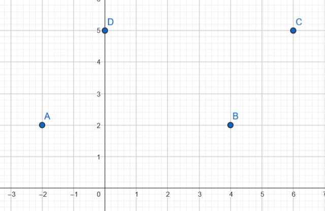 Na początek narysuj układ współrzędnych i zaznacz w nim trzy podane punkty. Następnie dopasowujemy tak punkt D, aby została utworzona szukana figura. Odczytaj współrzędne punktu D.