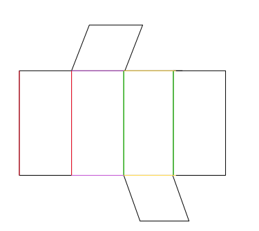 Narysuj siatkę graniastosłupa o podstawie rombu, jeśli krawędź podstawy ma 4 cm, a suma długości wszystkich krawędzi jest równa 56 cm. Zaznacz różnymi kolorami parę krawędzi równoległych.