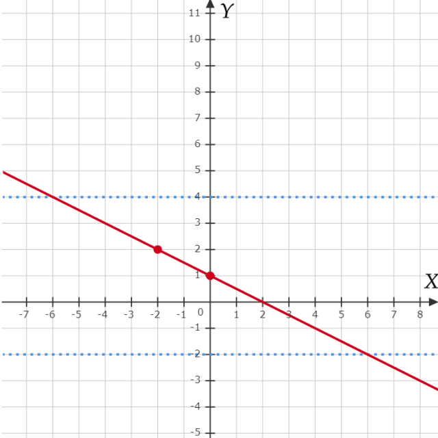 Odczytujemy dla jakich argumentów wykres znajduje się pomiędzy wartościami -2 i 4: