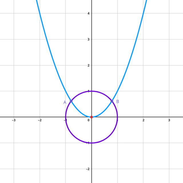 Ułóż układ równań z równania okręgu oraz paraboli. Wstaw równanie paraboli do równania okręgu. Znajdź miejsca zerowe powstałego w ten sposób równania dwukwadratowego, podstawiając