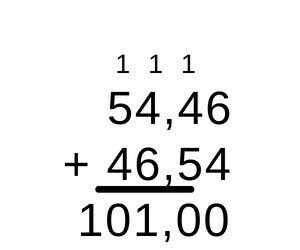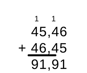 Wykonaj działania pisemne i porównaj liczby. Porównując liczby, najpierw patrz na ich liczby jedności, a jeśli są takie same, to porównuj je na podstawie następnych w kolejności cyfr. Liczba z większą cyfrą na danym miejscu jest większa. Wykonując dodawanie pisemne, najpierw należy w słupku dodać do siebie cyfry ze słupka znajdującego się najbardziej z prawej. Jeśli otrzymana liczba jest dwucyfrowa, należy cyfrę jedności takiego wyniku zapisać pod słupkiem cyfr jedności, a cyfrę dziesiątek z wyniku trzeba przenieść dalej poprzez dopisanie tej cyfry nad kolejnym w lewo słupkiem. Przy dodawaniu kolejnego słupka, do wyniku należy dodać przeniesioną cyfrę ze słupka wcześniej. W taki sam sposób należy dodawać każdy kolejny słupek, zaczynając od lewej i idąc do prawej. Jeśli w ostatnim słupku wyjdzie liczba większa od 10, to już nie wolno przenosić dalej, bo nie ma kolejnego słupka, lecz należy napisać całą liczbę. Pamiętaj, że przecinek wyniku będzie znajdował się pod przecinkami jego składników.