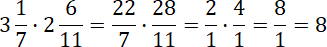 Na początek zamień liczby mieszane na ułamki niewłaściwe i wykonaj mnożenie. Skróć licznik jednego ułamka z mianownikiem drugiego oraz wyłącz całości z wyniku.