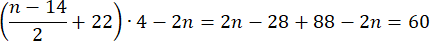 Pomyśl pewną liczbę, odejmij od niej 14, a różnicę podziel przez 2. Następnie do otrzymanego ilorazu dodaj 22 i wynik pomnóż przez 4. Od tego iloczynu odejmij liczbę dwa razy większą od pomyślanej, a powiem ci, że w rezultacie otrzymasz liczbę 60.