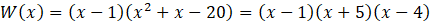 Aby rozwiązać zadanie skorzystaj z wyznaczonych w poprzednim zadaniu współczynników n i m. Zauważ, że jednym z pierwiastków wielomianu jest 1 (wielomian przyjmuje wartość zero dla x = 1). Ponieważ 1 jest pierwiastkiem wielomianu, wielomian jest podzielny przez x – 1. Podziel wielomian za pomocą schematu Hornera, a następnie zapisz W(x) jako iloczyn otrzymanego ilorazu i x – 1. Przekształć iloraz do postaci iloczynowej. Ponieważ wielomian W(x) zapisany jest jako iloczyn wielomianów stopnia pierwszego, możesz wprost odczytać jego rozwiązania.
