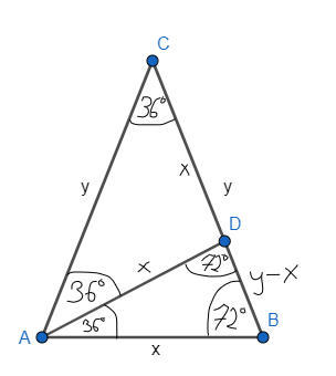 W trójkącie ABC, gdzie długość boku CA jest równa długości boku CB, a miara kąta ACB wynosi 36°, poprowadzono dwusieczną kąta BAC, która przecina bok BC w punkcie D. Oblicz