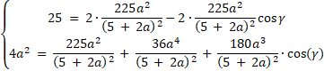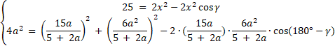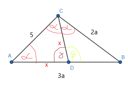 Zacznij od wykorzystania twierdzenia o dwusiecznej, aby uzależnić x od a. Skorzystaj z twierdzenia cosinusów w trójkącie CDB i w trójkącie ADC, stwórz układ równań i dodaj je stronami, aby pozbyć się