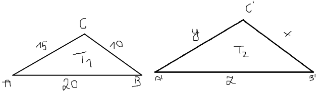 W tym zadaniu musisz wyznaczyć skalę podobieństwa trójkątów i na jej podstawie wyznaczyć długości boków trójkąta