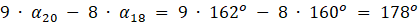 Kąt wewnętrzny 18-kąta foremnego ma miarę 160o, a kąt wewnętrzny 20-kąta foremnego – 162o. Zatem kąt