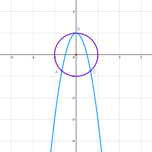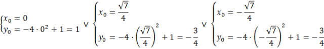 Ułóż układ równań z równania okręgu oraz paraboli. Wstaw równanie paraboli do równania okręgu. Wyznacz miejsca zerowe wielomianu stopnia czwartego, wykorzystując fakt, że iloczyn dwóch wyrażeń jest równy zeru wtedy i tylko wtedy, gdy przynajmniej jedno z nich jest zerem. Wstaw obliczone współrzędne punktów na odciętej do równania paraboli, by otrzymać współrzędne na rzędnej.