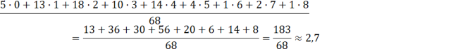 Średnią arytmetyczną zestawu liczb nazywamy ich sumę podzieloną przez ich ilość. Medianę danego zestawu odszukujemy, porządkując wszystkie dane od najmniejszej do największej wartości, a potem wybieramy wartość w środku. Skoro mediana jest w połowie, to gdyby ustawić wszystkie 68 liczb w ciągu rosnącym, to wartość równa medianie, byłaby średnią arytmetyczną pozycji 34 i 35, na których znajduje się wartość 2. Dominanta, kiedyś zwana modą, to wartość najczęściej pojawiająca się w danym zestawie. Dominant może być więcej niż jedna. Dopuszczalna jest też sytuacja, gdy ich nie ma w ogóle. Dzieje się tak, gdy każda liczba zapisana jest w tej samej ilości w zestawieniu.