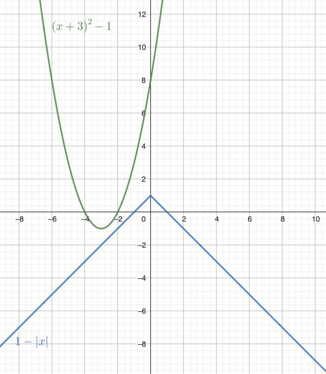 Narysuj wykresy funkcji f i g, zauważ, że wykres funkcji f jest przesunięciem wykresu funkcji o jedną jednostkę jednostki w dół i 3 jednostki w lewo. Ponadto wykres funkcji g jest przesunięciem wykresu funkcji o jedną jednostkę w górę. Następnie odczytaj z wykresów funkcji ich część wspólną.