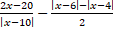 Rozwiąż nierówność podwójną rozbijając ją na dwie nierówności i opuść wartości bezwzględne na dwa przypadki. Zauważ, że zbiór wartości jest niemniejszy od -4 i nie większy od 10, czyli miejsc zerowych naszych wartości bezwzględnych w wyrażeniu. Opuść je patrząc, czy wyrażenie jest mniejsze czy większe od zera i uprość wynik.