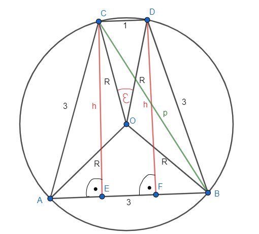 Czworokąt o bokach o długości 1, 3, 3 i 4 został wpisany w okrąg. Oblicz miarę kąta środkowego, który opiera się na łuku wyznaczonym przez najkrótszy bok czworokąta.