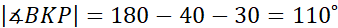 Suma miar kątów w każdym trójkącie wynosi 180˚. Skorzystaj z tej własności do policzenia kąta BKP w trójkącie BKA: