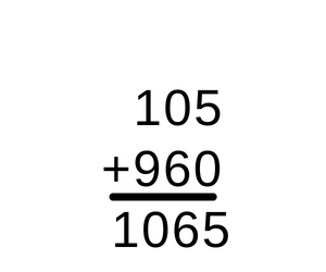 Żeby dostać liczbę o 105 większą od 960, należy do 960 dodać 105. Wykonując dodawanie pisemne, najpierw należy w słupku dodać do siebie cyfry jedności. Jeśli otrzymana liczba jest dwucyfrowa, należy cyfrę jedności takiego wyniku zapisać pod słupkiem cyfr jedności, a cyfrę dziesiątek z wyniku trzeba przenieść dalej poprzez dopisanie tej cyfry nad kolejnym w lewo słupkiem, czyli słupkiem cyfr dziesiątek. Przy dodawaniu kolejnego słupka, do wyniku należy dodać przeniesioną cyfrę ze słupka wcześniej. W taki sam sposób należy dodawać każdy kolejny słupek, zaczynając od lewej i idąc do prawej. Jeśli w ostatnim słupku wyjdzie liczba większa od 10, to już nie wolno przenosić dalej, bo nie ma kolejnego słupka, lecz należy napisać całą liczbę.