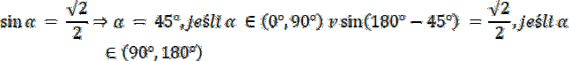 sin 45° = sin135°⇒ α = 45° ∨ α = 135°, dla α ⋲ (0°, 180°)