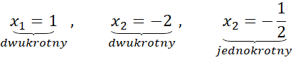 Przenieś wszystkie wartości na jedną stronę równania i przedstaw je w najprostszej postaci. Skorzystaj z tego, że powstałe równanie jest zerem, gdy któryś z nawiasów wyzeruje się i na tej podstawie wyznacz rozwiązanie każdego z równań w powstałych nawiasach. Na koniec wyznacz krotność każdego z nich.