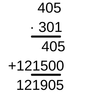 Żeby dostać liczbę 405 razy większą od 301, należy pomnożyć 301 przez 405. Wykonując mnożenie pisemne przez liczbę wielocyfrową, należy najpierw pomnożyć cyfrę jedności liczby, przez którą mnożysz, przez cyfrę jedności drugiej liczby. Jeśli otrzymana liczba jest dwucyfrowa, należy cyfrę jedności takiego wyniku zapisać pod słupkiem cyfr jedności, a cyfrę dziesiątek z wyniku trzeba przenieść dalej poprzez dopisanie tej cyfry nad kolejnym w lewo słupkiem, czyli słupkiem cyfr dziesiątek. Przy mnożeniu kolejnego słupka, do wyniku dodaje się przeniesioną cyfrę ze słupka wcześniej. W taki sam sposób należy mnożyć każdą kolejną cyfrę, zaczynając od lewej i idąc do prawej. Jeśli w ostatnim słupku wyjdzie liczba większa od 10, to już nie wolno przenosić dalej, bo nie ma kolejnego słupka, lecz należy napisać całą liczbę. Po pomnożeniu przez cyfrę jedności należy wykonać te same operacje, mnożąc przez kolejne cyfry, zaczynając od dziesiątek. Z każdą kolejną cyfrą, przez którą mnożysz w sekcji dodawania, dopisuj z prawej strony jedno zero. Na końcu wykonaj dodawanie pisemne. Dodawaj kolejno każdy ze słupków, począwszy od jedności, a gdy po dodaniu wynik będzie dwucyfrowy, to liczbę jedności zapisz pod tym słupkiem, a liczba dziesiątek przejdzie dalej do następnego słupka.