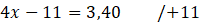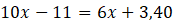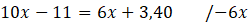 Z treści zadania wiesz, że 10 puszek karmy pomniejszone o 11 zł, kosztuję tyle samo co 6 puszek karmy i 3,40 zł.