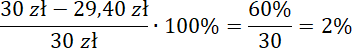 Cena spadła do 29,40 zł, czyli o 0,60 zł. Oblicz, jaki to procent początkowej ceny: