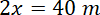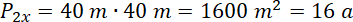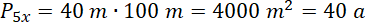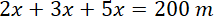 podzielono na trzy prostokątne działki, których pola pozostają w stosunku 2 : 3 : 5. Linie podziału są prostopadłe do dłuższego boku placu. To znaczy, że każda działka ma jeden bok równy 40 m, a drugi bok jest odpowiednią częścią boku 200 m. Wprowadź zmienną x, aby zachować stosunek między bokami i Oblicz wymiary działek:
