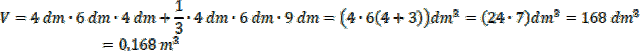Aby obliczyć objętość bryły, musisz dodać objętość prostopadłościanu i ostrosłupa o wspólnej podstawie . Wysokość prostopadłościanu to 4 dm, a ostrosłupa 9 dm. Objętość musisz przedstawić następnie w metrach sześciennych.