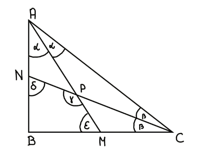 W tym zadaniu uzasadnij, że największy kąt czworokąta CNPM ma miarę 135°, wiedząc, że dwusieczne AM i BN kątów ostrych trójkąta prostokątnego ABC przecinają się w punkcie P, a punkty M i N leżą na bokach trójkąta.