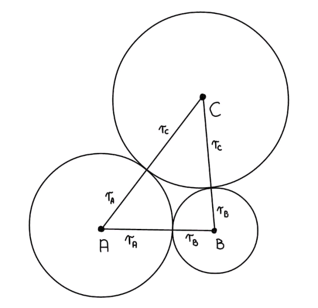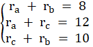 W tym zadaniu oblicz długości promieni okręgów A, B, C stycznych zewnętrznie, wiedząc, że AB| = 8, |BC| = 10, |AC| = 12.
