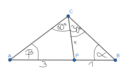 Na boku AB trójkąta ABC wybrano punkt P w taki sposób, że długość odcinka AP wynosi 3, długość odcinka BP wynosi 1, miara kąta ACP wynosi 60°, a miara kąta BCP wynosi 30°. Oblicz pole trójkąta ABC.