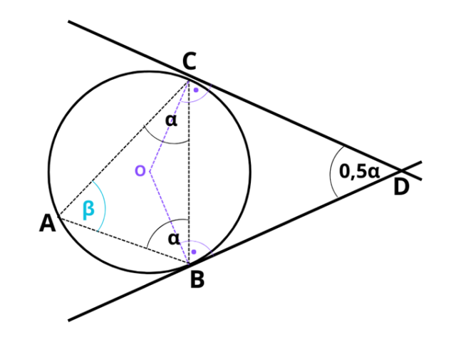 Punkty A, B, C należą do okręgu oraz | ∢CBA| = | ∢ACB|. Przez punkty B i C poprowadzono styczne do okręgu, które przecięły się w punkcie D, 2 | ∢CDB| = | ∢CBA|. W tym zadaniu musisz obliczyć miarę kąta między ramionami trójkąta ABC.