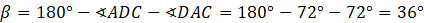 Kąty DBC i DCB są równe, bo trójkąt DBC jest równoramienny. Oblicz miarę kąta alfa. Następnie miarę kąta przyległego do kąta alfa – kąta CDA. Trójkąt CDA jest równoramienny, więc kąty przy jego podstawie są równe. Na koniec oblicz miarę kąta beta.
