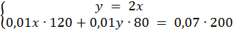 Oblicz stężenia roztworów, które zmieszano, jeżeli wzięto 120 g pierwszego roztworu, a następnie dolano roztworu o stężeniu dwukrotnie większym i ostatecznie otrzymano 200 g roztworu o stężeniu 7%.