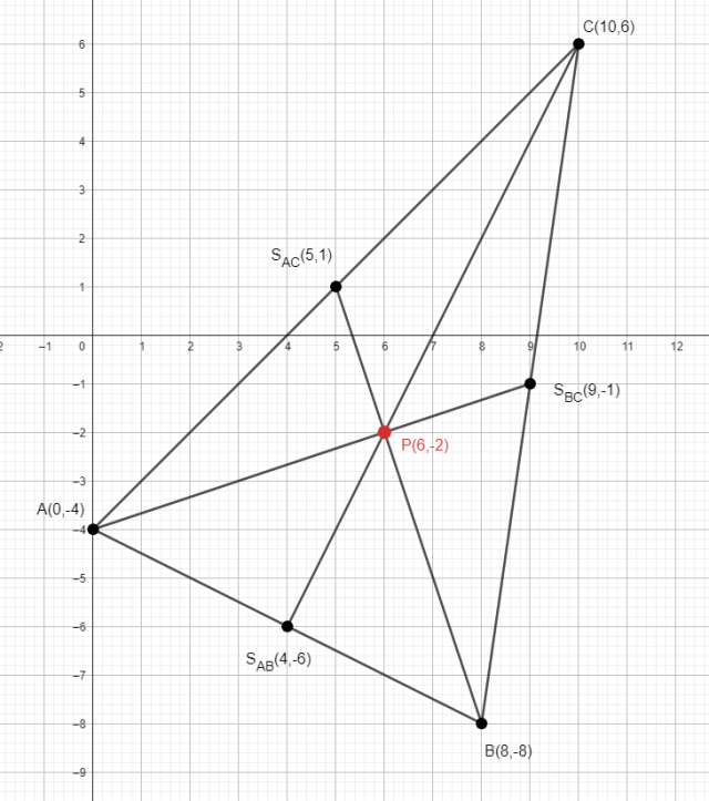 Graficznie określ współrzędne środku ciężkości trójkąta, czyli punktu w którym przecinają się jego środkowe (środkowa trójkąta to odcinek, który łączy wierzchołek trójkąta ze środkiem przeciwległego boku), o wierzchołkach w punktach