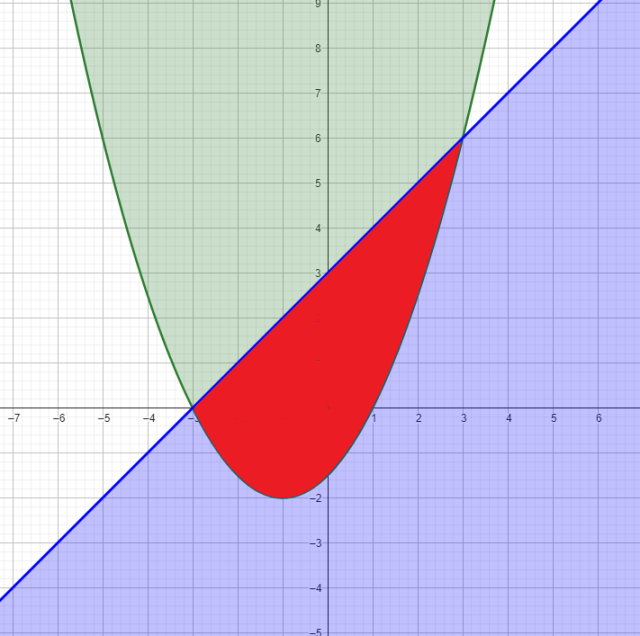 Narysuj dwie funkcje w jednym układzie współrzędnych. Opisany zbiór będzie znajdował się nad wykresem funkcji f i pod wykresem funkcji g.