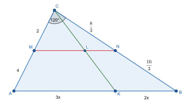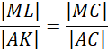 W trójkącie ABC przedstawionym na rysunku obok, na bokach AC i BC wybrano punkty M i N, które podzieliły każdy z tych boków w stosunku 2:1. Z wierzchołka C poprowadzono półprostą, która przecięła bok AB w punkcie K, a odcinek MN – w punkcie L. Musisz obliczyć długość odcinka ML, przy czym |AK| =