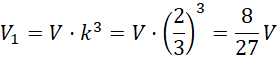 Stożek o podstawie z przekroju jest bryłą podobną do całego stożka. Jego wysokość to dwie trzecie wysokości całego stożka, zatem skala podobieństwa brył to: