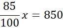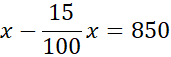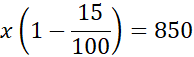 Zapisz równanie – od ceny początkowej roweru odejmij 15% z niej i przyrównaj do 850, czyli ceny po obniżce. Wylicz x z równania.