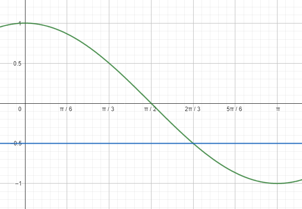 Przekształć równanie, a następnie narysuj wykres i odczytaj, dla jakiego argumentu funkcja trygonometryczna przecina się z prostą. Wynik zawęź do podanego przedziału.