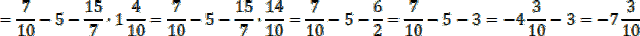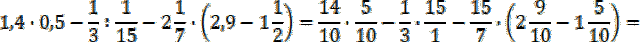 Zapisz liczby w postaci zwykłej – nie jest możliwe przedstawienie dzielnej i dzielnika jako ułamków dziesiętnych skończonych. Pamiętaj o kolejności wykonywania działań: najpierw wykonaj mnożenie, dzielenie i odejmowanie w nawiasie (można wykonać je równocześnie, bo nie wpływają one na siebie na tym etapie), a następnie mnożenie przed nawiasem, na koniec pozostaje odejmowanie. Zastąp dzielenie mnożeniem przez odwrotność dzielnika i mnóż ze sobą dwie pierwsze pary liczb w wyrażeniu (skracaj, gdy jest to możliwe), jednocześnie wykonaj odejmowanie w nawiasie, a wynik zapisz w postaci ułamka niewłaściwego, podobnie jak czynnik sprzed nawiasu. Wykonaj mnożenie na końcu wyrażenia, a potem odejmij od siebie wszystkie liczby.
