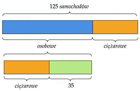 Samochodów osobowych jest o 35 więcej niż ciężarowych, a łącznie jest ich 125. Więc samochodów ciężarowych jest: (125 – 35) : 2 = 45, a osobowych: 45 + 35 = 80.