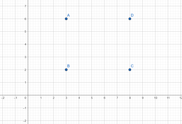 W tym zadaniu musisz podać współrzędne czwartego punktu tak, aby tworzył on z trzema pozostałymi prostokąt.