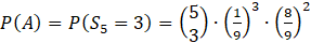W tym zadaniu musisz obliczyć prawdopodobieństwo zdarzenia A – 3 razy uzyskano liczby oczek, których iloczyn wynosi 12, jeśli rzucamy 5 razy dwiema sześciennymi kostkami do gry.