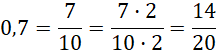 Zamień ułamek dziesiętny na ułamek zwykły o liczniku 14, do tego celu najpierw zamień ułamek dziesiętny na zwykły i rozszerz otrzymany ułamek przez 2, żeby w liczniku było 14. Po zamianie ułamka możesz porównać, go z ułamkiem z gwiazdką.Pamiętaj, że ułamki o wspólnych mianownikach są takie same, tylko wtedy, gdy mają takie same liczniki. Zamieniając ułamki dziesiętne na zwykłe, należy liczbę przed przecinkiem zapisać jako całości, a liczbę po przecinku jako licznik. W mianowniku należy wpisać liczbę, która ma na początku 1 i tyle zer, ile ułamek dziesiętny ma miejsc po przecinku.