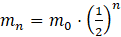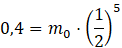 Po każdym okresie połowicznym masa pierwiastka zmniejsza się połowę. Oblicz ilość okresów połowicznego rozkładu w czasie 40 dni, a następnie podstaw dane do wzoru.