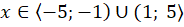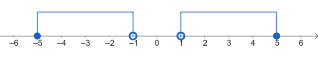 Liczby spełniające równanie to te, których odległość od 0 na osi liczbowej jest mniejsza lub równa 5 i większa od 1, a więc liczby z przedziału od 1 do 5 i symetrycznie po drugiej stronie od 0: od -5 do -1. Zapisz zbiór rozwiązań i zaznacz go na osi liczbowej.