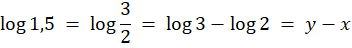 Zapisz 1,5 jako iloraz 3 i 2. Następnie rozpisz logarytm ilorazu jako różnicę logarytmów i zastosuj podstawienie x i y.