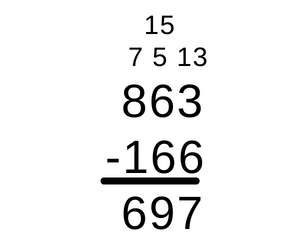Uprość działanie przez policzenie na początku sumy, jaka znajduje się w nawiasie. Następnie pamiętając, że minus przed nawiasem zmienia znaki liczb wewnątrz nawiasu na przeciwne, zamień znak liczby 166 na minus i wykonaj odejmowanie liczb 863 i 166. Wykonując dodawanie pisemne, najpierw należy w słupku dodać do siebie cyfry jedności. Jeśli otrzymana liczba jest dwucyfrowa, należy cyfrę jedności takiego wyniku zapisać pod słupkiem cyfr jedności, a cyfrę dziesiątek z wyniku trzeba przenieść dalej poprzez dopisanie tej cyfry nad kolejnym w lewo słupkiem, czyli słupkiem cyfr dziesiątek. Przy dodawaniu kolejnego słupka, do wyniku należy dodać przeniesioną cyfrę ze słupka wcześniej. W taki sam sposób należy dodawać każdy kolejny słupek, zaczynając od lewej i idąc do prawej. Jeśli w ostatnim słupku wyjdzie liczba większa od 10, to już nie wolno przenosić dalej, bo nie ma kolejnego słupka, lecz należy napisać całą liczbę. Wykonując odejmowanie pisemne najpierw, należy w słupku odjąć od siebie cyfry jedności. Jeśli nie można odjąć cyfr, ponieważ odjemnik jest większy od odjemnej, to należy pożyczyć jedną dziesiątkę ze słupka z lewej strony. Wtedy odjemna w słupku, w którym wykonujemy odejmowanie stanie się o dziesięć większa, a odjemna w kolejnym na lewo słupku zmaleje o jeden. W taki sam sposób należy odejmować każdy kolejny słupek, zaczynając od prawej i idąc do lewej.